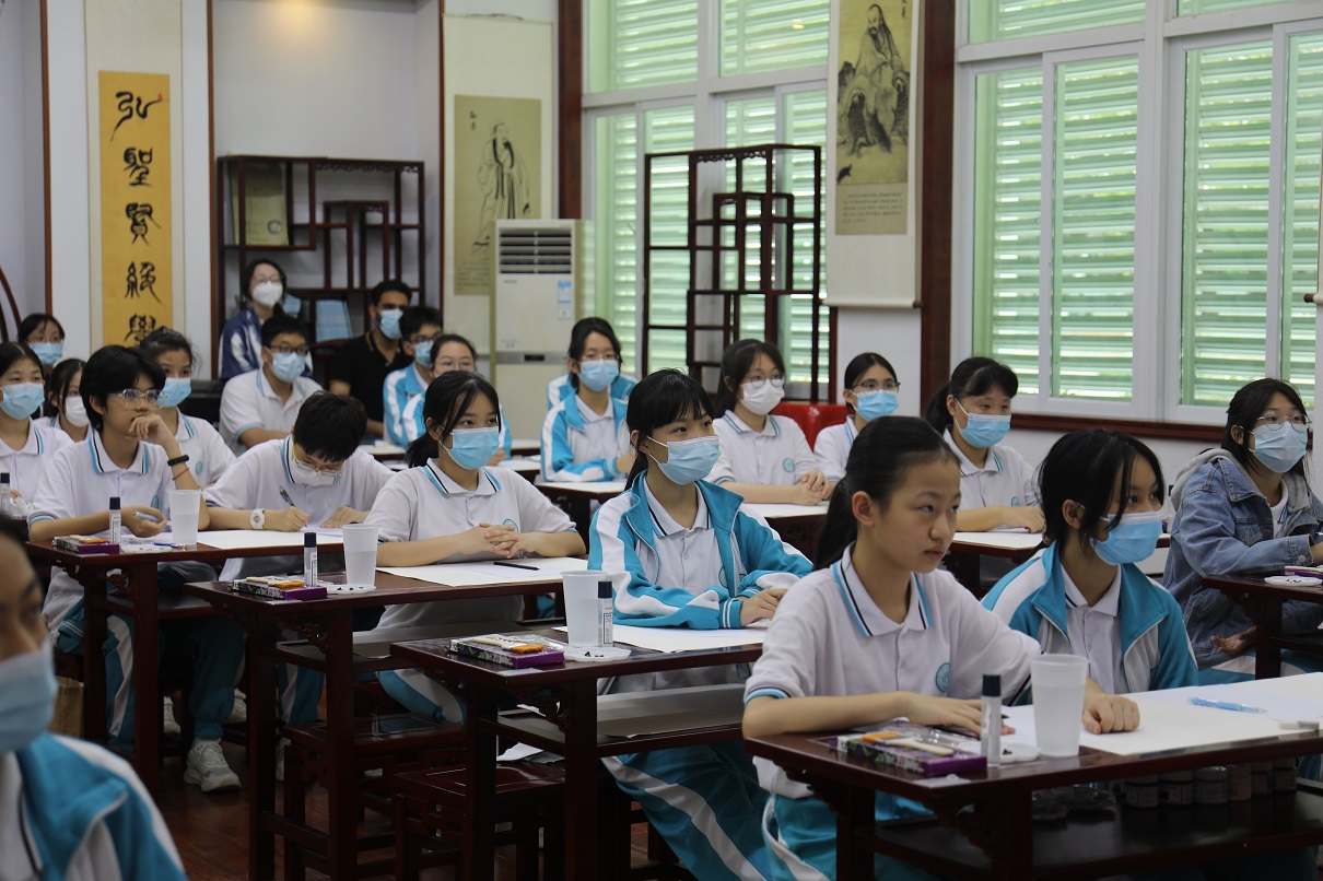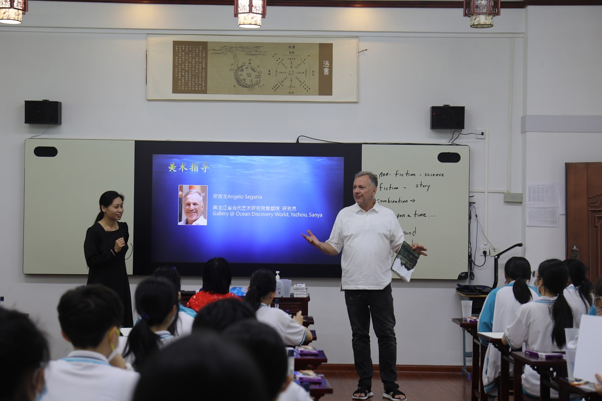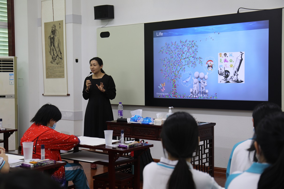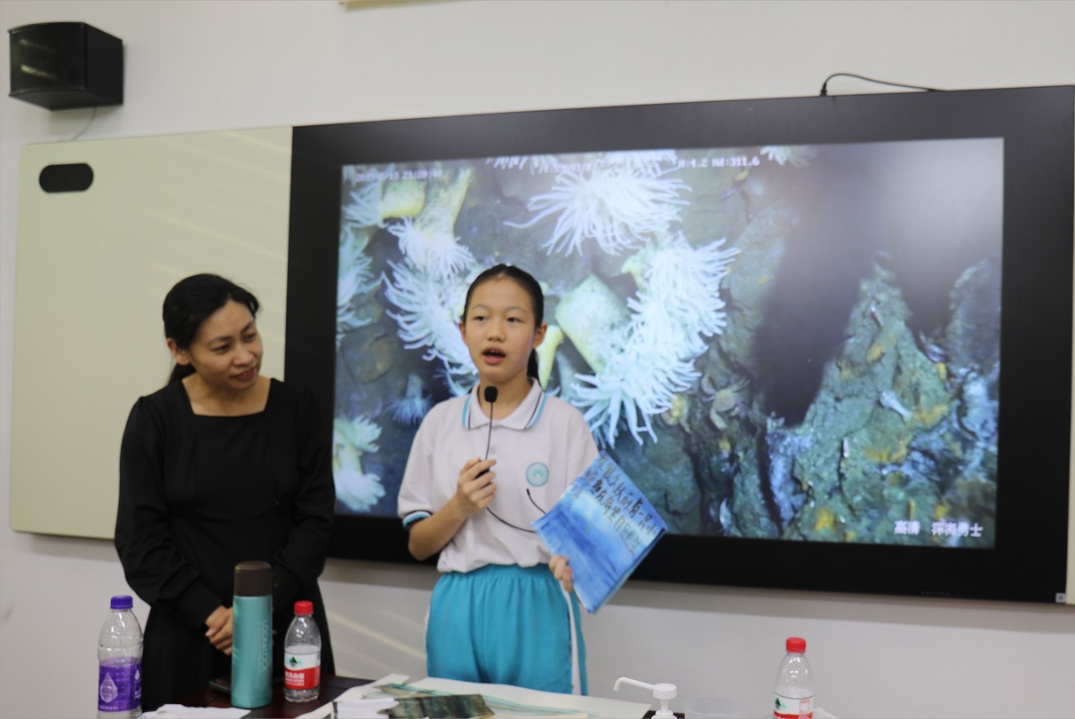 首先,來(lái)自深海所地外海洋系統研究室劉翠艷研究員為同學(xué)們開(kāi)展生動(dòng)的科普宣講,以幻燈片展示、現場(chǎng)交流互動(dòng)以及視頻介紹等方式通俗易懂地傳授生命的豐富形式、講述海洋故事,科普深海知識,宣教“地外海洋”概念,提升海洋文化的親和力、感召力與影響力。同學(xué)們聽(tīng)得津津有味,受益匪淺。在隨后的藝術(shù)創(chuàng )作環(huán)節,活動(dòng)特邀藝術(shù)家Angelo Segarra先生作為現場(chǎng)美術(shù)指導,引導學(xué)生們繪制圖冊來(lái)編寫(xiě)一個(gè)科學(xué)性或科幻性的海洋故事?;顒?dòng)中,學(xué)生們認真作畫(huà),在水彩描繪的背景上勾畫(huà)出海洋中的珊瑚、水草、魚(yú)、蝦、蟹、水母、鯨魚(yú)等海洋生物,呈現他們腦海中的海洋故事?;顒?dòng)最后,學(xué)生們現場(chǎng)分享自己的作品:初一的陳雅昀同學(xué)生動(dòng)形象地繪制了海洋中危險環(huán)境,提醒大家要敬畏海洋,不要到危險未知區域玩耍;李雅倩同學(xué)則描繪了一只誤吞塑料袋的小鯨魚(yú)痛苦地向人類(lèi)呼救,呼吁大家保護海洋環(huán)境,重視海洋污染;簡(jiǎn)玉萱同學(xué)則用擬人的手法編寫(xiě)了一個(gè)小螃蟹和小鰻魚(yú)斗智斗勇的故事?;顒?dòng)結束后,同學(xué)們紛紛表示對深??茖W(xué)、海洋生態(tài)保護以及地外海洋的探索產(chǎn)生了濃厚的興趣。