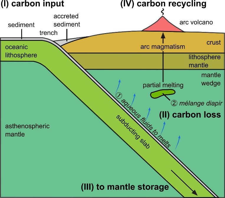 圖1. 以深部碳循環(huán)為視角的俯沖帶示意圖。碳通過(guò)多種途徑參與深部循環(huán):(I)沉積巖和大洋巖石圈(即地殼和巖石圈地幔)巖石向俯沖帶輸入碳。(II)在俯沖過(guò)程中,碳通過(guò)脫揮發(fā)分作用、溶解及部分熔融等方式從俯沖板塊中釋放。(III)部分碳被進(jìn)一步帶入地幔深處并儲存;(IV)一部分碳通過(guò)弧火山作用重新返回地表。需要注意的是,俯沖板片中碳的釋放可以用兩種端元模式來(lái)解釋。①傳統模式:認為俯沖板塊釋放的流體和熔體導致地幔楔發(fā)生部分熔融,從而產(chǎn)生弧巖漿;②混雜巖(mélange)模式:認為俯沖板塊的沉積物、蝕變洋殼和水化的地幔物理混合形成的混合巖,以底辟(diapirs)的形式上升到地幔楔,熔化后產(chǎn)生弧巖漿。