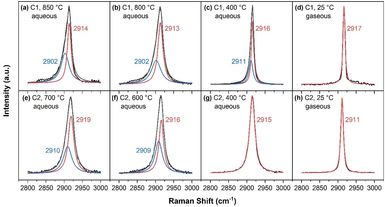 圖 3 2800-3000?cm-1波長(cháng)區域內從高溫到低溫還原的含CH4的含水流體和氣相的拉曼光譜擬合結果。在C1實(shí)驗中,鋯石被用作壓標。800和850 ℃的拉曼光譜是在加熱過(guò)程中收集的,而400和25 ℃的光譜則是在達到最高溫度后冷卻過(guò)程中獲得的。在C2實(shí)驗中,沒(méi)有使用壓標,以消除潛在的硅酸鹽干擾。600和700 ℃的拉曼光譜是在加熱過(guò)程中采集的,而400和25 ℃的拉曼光譜是在達到最高溫度后冷卻過(guò)程中采集的。請注意,紅色曲線(xiàn)表示擬合的CH4主峰,藍色曲線(xiàn)表示擬合的肩峰。