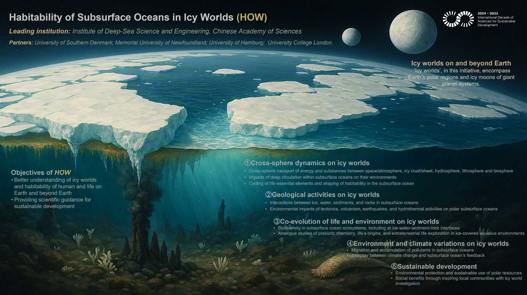 5月5日,由中國科學(xué)院深??茖W(xué)與工程研究所(簡(jiǎn)稱(chēng)深海所)牽頭的國際大科學(xué)計劃“Habitability of Subsurface Oceans in Icy Worlds (HOW)”獲得聯(lián)合國教科文組織(UNESCO)可持續發(fā)展國際科學(xué)十年(International Decade of Sciences for Sustainable Development, IDSSD)執行委員會(huì )批準。