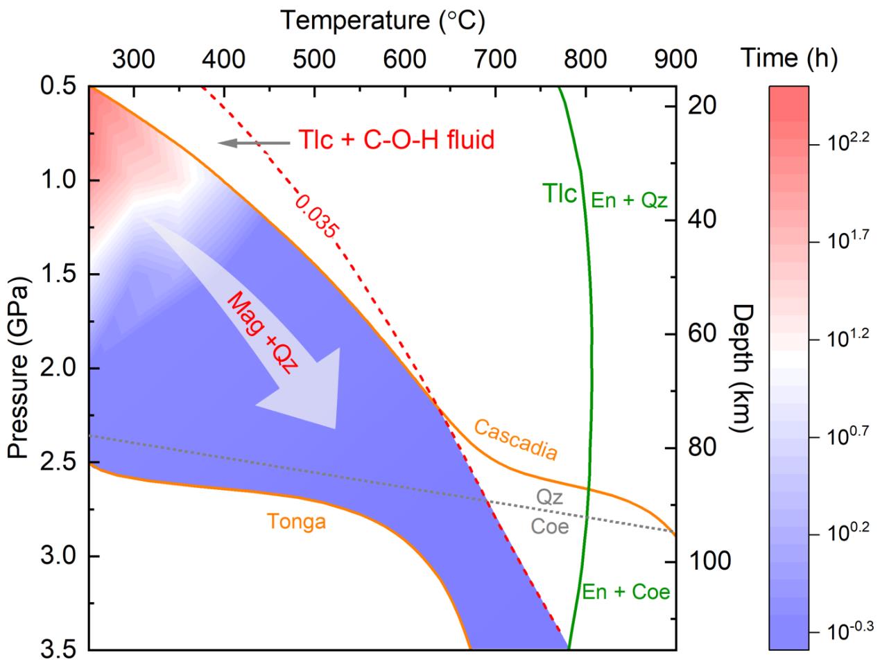 本研究采用金剛石壓腔(DAC)結合原位拉曼光譜技術(shù),系統研究了俯沖帶溫度壓力條件下滑石與C-O-H流體的碳酸化反應過(guò)程。研究結果發(fā)現滑石在溫度> 250°C、壓力>1 GPa時(shí),可快速轉化為菱鎂礦與石英,有效地將流體中的CO2封存到新形成的熱力學(xué)更穩定的菱鎂礦中,從而被挾帶進(jìn)入地球深部(見(jiàn)附圖)。此外,滑石碳酸化后還可能通過(guò)改變俯沖帶礦物組成,影響到包括地震活動(dòng)性在內的動(dòng)力學(xué)過(guò)程。本研究的結果構建了滑石碳酸化反應的熱力學(xué)相圖,為更好地理解地球深部碳循環(huán)過(guò)程和受相變影響所致的地球動(dòng)力學(xué)行為提供了必要的實(shí)驗約束。