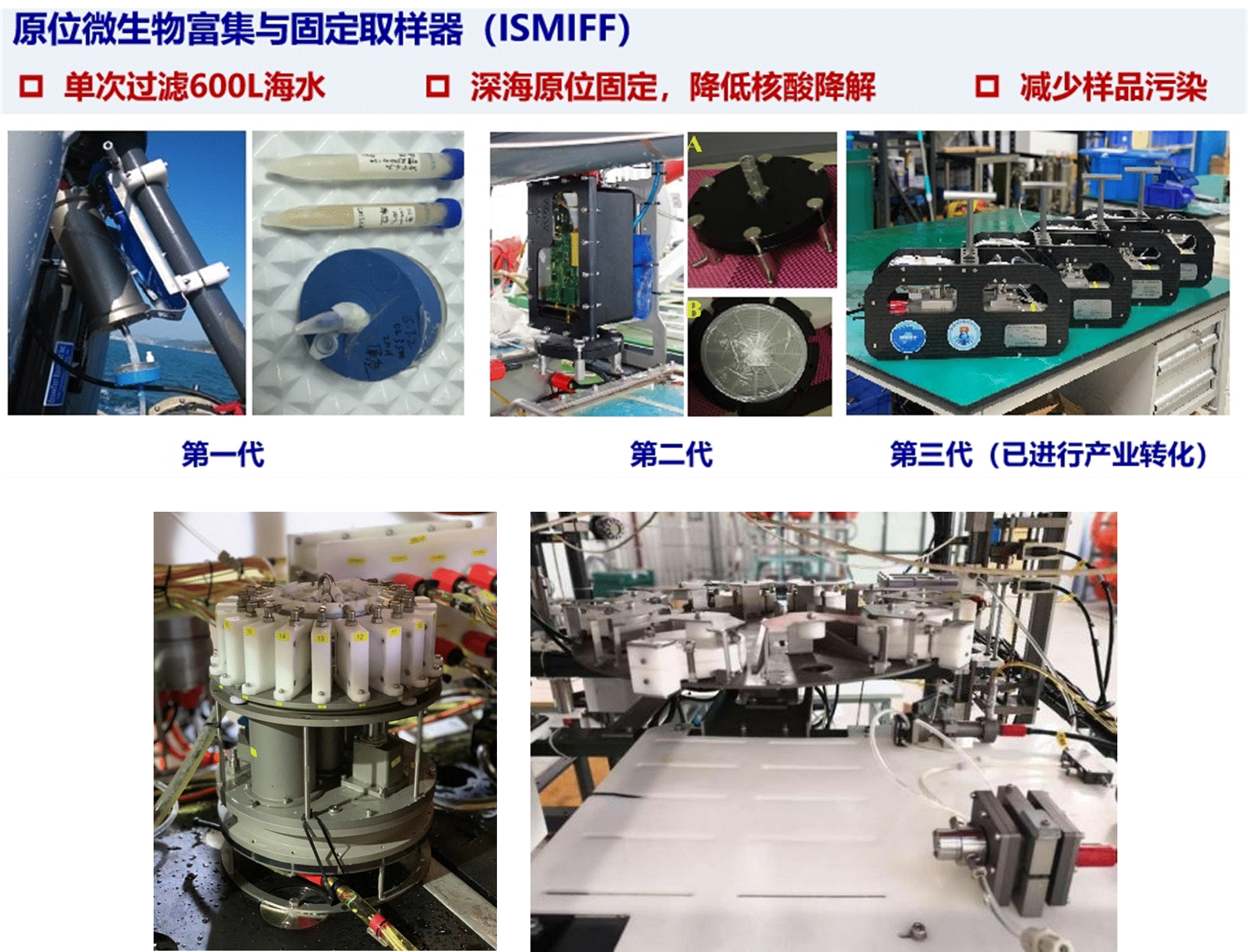研究室圍繞工程技術(shù)與科學(xué)研究的交叉學(xué)科合作,面向深海生物學(xué)研究需求,開(kāi)展了系列極具特色的研究工作。成功研發(fā)了原位微生物富集與固定取樣器,在我國首個(gè)深淵科考航次中得到應用,成功獲取了馬里納亞海溝5000-11000米微生物群落的垂直分布特征,目前已實(shí)現產(chǎn)業(yè)轉化。為滿(mǎn)足多時(shí)空尺度的取樣需求,進(jìn)一步研發(fā)了多序列原位微生物富集與固定取樣器。