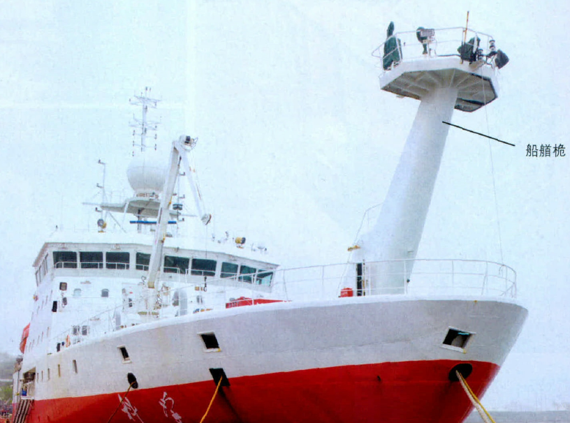 一眼望去,“科學”號船艏部向斜上方伸出的一個部件非常引人注目,它叫船艏桅,也被科學家們稱為“科學桅”。在艏桅上面,是海洋大氣和海氣通量的觀測平臺。海氣通量是指在單位時間內、單位面積上,海洋和大氣之間發生的物質(水汽、二氧化碳等)及能量交換的量。海氣通量平臺是測量垂直方向上數據的觀測設備,它的換能器和水面的距離不能低于15米。這個平臺之所以設計在船的艏部并做成向斜上方傾斜的形式,主要是因為這個位置對海洋大氣和海氣通量觀測的干擾和影響最小。通過這個平臺,科學家們可以向船艏下方放置換能器,實時測量海洋和大氣之間物質、能量交換的參數。