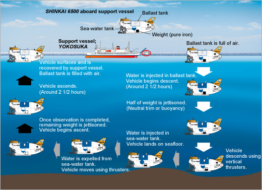 20123月,JAMSTEC“SHINKAI 6500”號進行了最大規模的一次升級改造。原來的主擺動式船尾推進器被兩個中等大小的船尾推進器代替,另外還安裝了一個船尾水平推進器,深潛器便可以更快更平穩地轉彎。對于所有推進器的發動機,液壓泵和海水泵也被新的具有更快反應能力的發動機取代