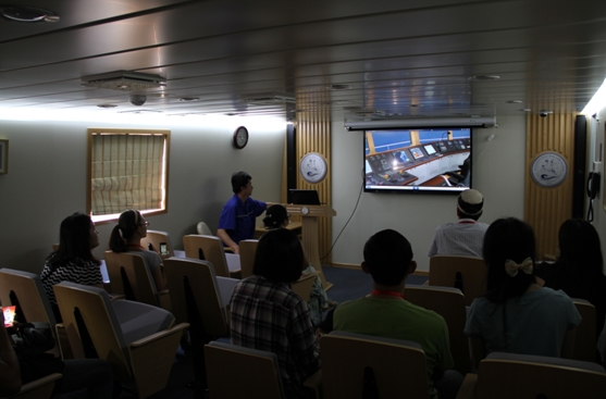 “科學(xué)”號(hào)船長(zhǎng)隋以勇詳細(xì)介紹了“科學(xué)”號(hào)的船舶設(shè)計(jì)、建造過(guò)程以及各項(xiàng)參數(shù)性能。考察團(tuán)一行參觀了駕駛室、綜合儀器室、實(shí)驗(yàn)室、機(jī)艙、絞車(chē)艙、作業(yè)甲板等工作場(chǎng)所,以及住房、餐廳、休閑、健身等生活場(chǎng)所,對(duì)船舶動(dòng)力定位、減搖水艙功能和綜合科學(xué)考察能力進(jìn)行了詳細(xì)了解。