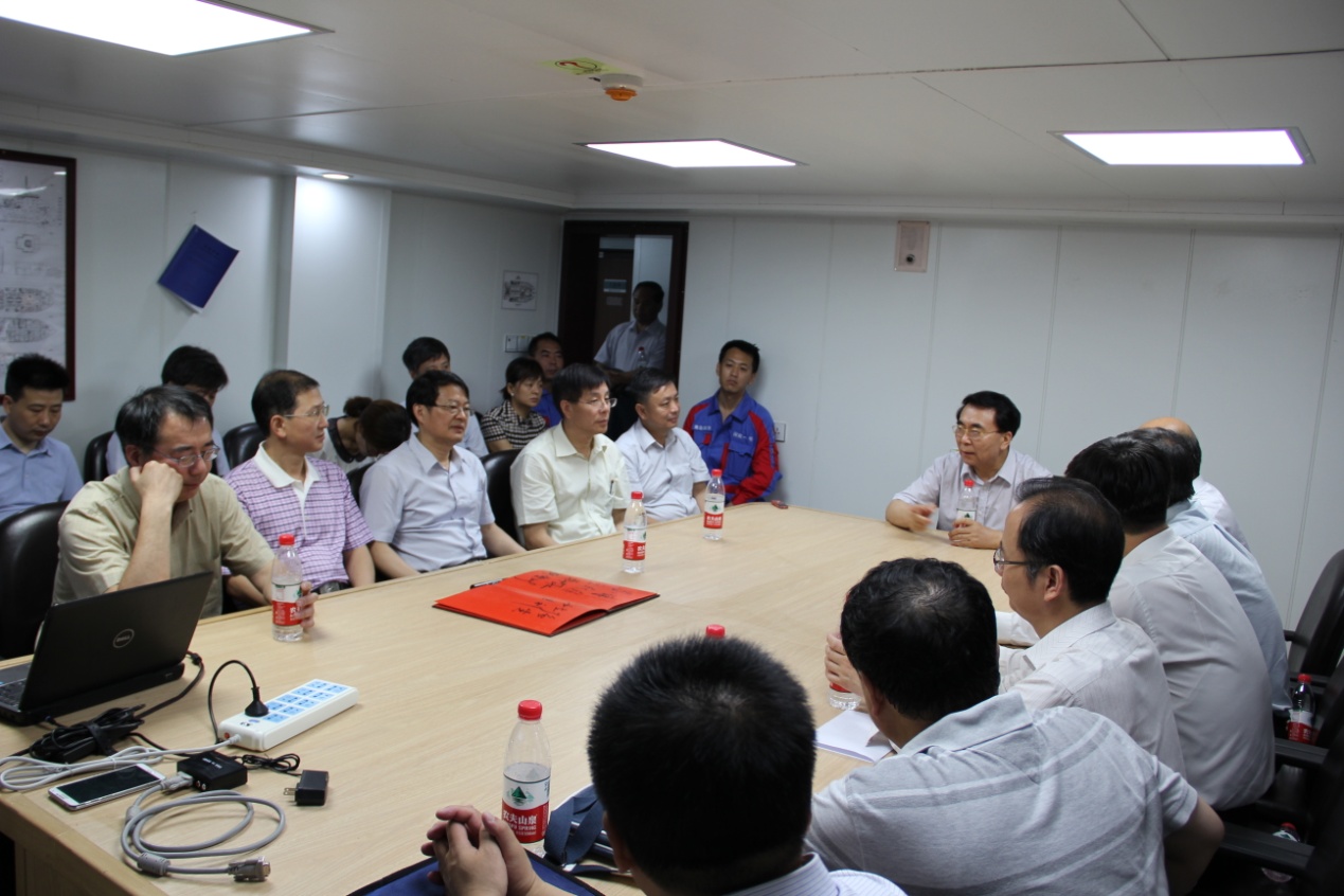 白春禮首先來到“探索一號”科考船,參觀了實驗室、潛水器調度指揮中心、DP2級動力定位系統等。在科考船會議室,聽取了船改工作組改修情況、船舶定位及承擔的海上科學考察任務情況的總體匯報。