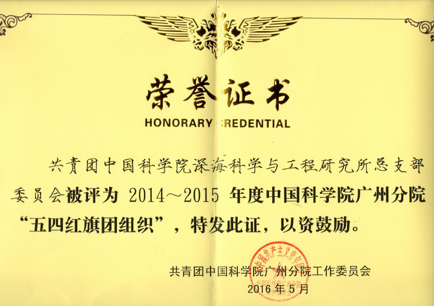 為進(jìn)一步推進(jìn)中國科學(xué)院廣州分院基層團(tuán)組織的各項(xiàng)建設(shè),增強(qiáng)團(tuán)組織的凝聚力和戰(zhàn)斗力,引導(dǎo)團(tuán)員、團(tuán)干部積極投身實(shí)施 “率先行動(dòng)”計(jì)劃,廣州分院團(tuán)工委在“五四青年節(jié)”期間,表彰一批2014~2015年度廣州分院“五四紅旗團(tuán)組織”、優(yōu)秀團(tuán)干部和優(yōu)秀團(tuán)員。深海所團(tuán)總支部被評(píng)為“2014~2015年度中國科學(xué)院廣州分院五四紅旗團(tuán)組織”,吳乃天同志被評(píng)為“2014~2015年度中國科學(xué)院廣州分院優(yōu)秀共青團(tuán)干部”。