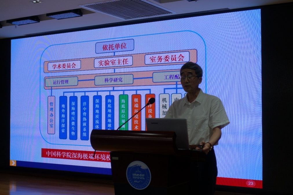 驗收論證會上,重點實驗室主任梅升華研究員代表重點實驗室做了驗收報告,向?qū)<医M和院機關(guān)領(lǐng)導(dǎo)介紹了籌建期內(nèi)重點實驗室的建設(shè)情況。周義明研究員、蔣磊正高級工程師和張維佳副研究員分別在室內(nèi)極端環(huán)境模擬手段、深海超高壓模擬實驗裝置和深海微生物適應(yīng)性機制三個方向做了學術(shù)報告,充分展示了重點實驗室的研究優(yōu)勢和學科特色。