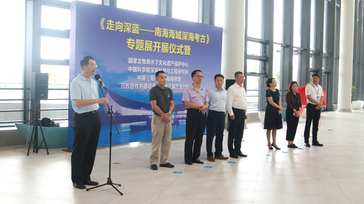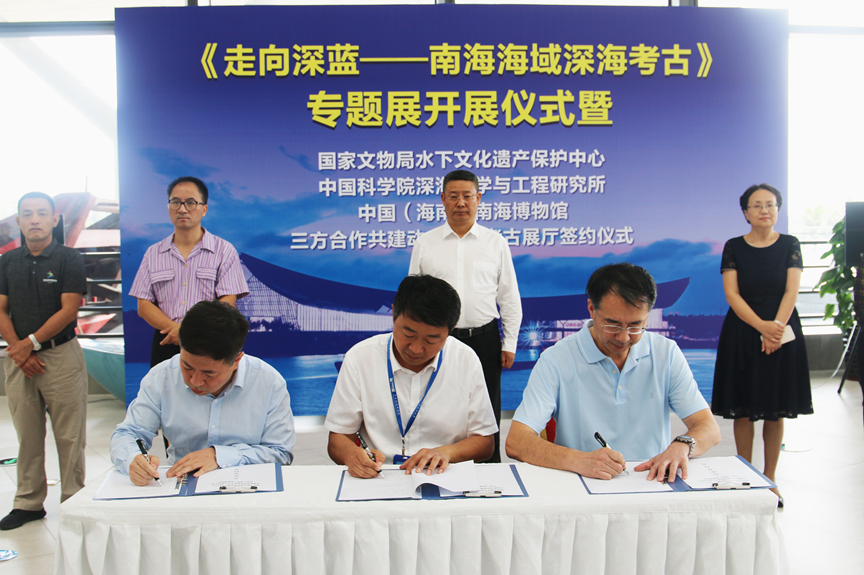 2019年3月22日上午,《走向深藍——南海海域深??脊拧穼n}展開展儀式暨國家文物局水下文化遺產保護中心、中國科學院深??茖W與工程研究所、中國(海南)南海博物館三方合作共建動態水下考古展廳簽約儀式在中國(海南)南海博物館順利舉行。