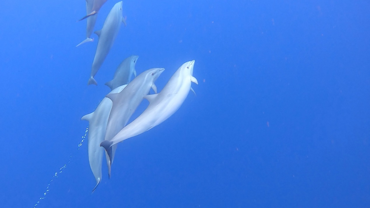 經對考察結果進行初步分析發現,本航次目擊到的鯨類動物至少包含11個物種,其中深潛鯨類物種7種,分別為抹香鯨、柯氏喙鯨、短肢領航鯨、瑞氏海豚(又叫鯨)、偽虎鯨、小虎鯨和瓜頭鯨,其它遠海鯨類物種4種,分別為熱帶斑海豚、弗氏海豚、長吻飛旋海豚和條紋海豚,表明考察海域具有較為豐富的鯨類物種多樣性。與該研究團隊去年執行的“2019年南海深潛及遠海鯨類科考”航次結果相比,此次科考航次記錄到了更多的鯨類物種,獲取到了更為豐富的數據。去年記錄到的8個鯨類物種中,除了一種神秘的喙鯨沒有在本航次被確認發現以外,所有其它7個物種均被再次記錄到,同時還新發現并記錄到小虎鯨、偽虎鯨、長吻飛旋海豚、瓜頭鯨等4個鯨類物種。