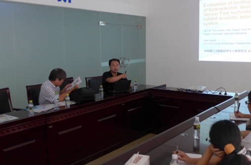 鄧志群領(lǐng)導(dǎo)的團(tuán)隊(duì)近年來主要開展生態(tài)聲學(xué)監(jiān)測及海洋能等方面的研究,本次訪問他做了題為“基于海洋生物警報(bào)系統(tǒng)下的海洋可再生能源保護(hù)”(Marine Animal Alert System to Support Marine Renewable Energy)和“利用聲學(xué)遙感系統(tǒng)來監(jiān)測和追蹤三文魚幼魚及其他魚類”(An acoustic telemetry system for detecting and tracking juvenile salmon and other fishes)兩個(gè)報(bào)告,分別介紹了其團(tuán)隊(duì)研發(fā)的小型水聽器在魚類洄游標(biāo)記、監(jiān)測乃至生態(tài)建模中的系統(tǒng)運(yùn)作原理和成功運(yùn)用案例;針對潮汐發(fā)電站設(shè)計(jì)研發(fā)出一套運(yùn)用主被動聲學(xué)監(jiān)聽裝置對海洋哺乳動物進(jìn)行監(jiān)測和定位的預(yù)警保護(hù)系統(tǒng)(接近觸發(fā)停運(yùn)機(jī)制),從而保護(hù)鯨豚動物。