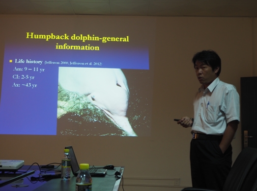 報告中,黃祥麟以臺灣西海岸國光石化廠的興建對附近水域中華白海豚生存狀況的影響為切入點,介紹了以中華白海豚為例的種群滅絕風險評估步驟。隨后,黃祥麟與參會科研人員分享了最近的科研成果,即通過分析衛星影像資料的歷史變化,評估臺灣西海岸、福建廈門、廣東珠江口和廣西欽州等中華白海豚重要分布地區填海的程度,發現中華白海豚面臨適宜棲息地大范圍喪失的嚴重威脅,并提出相關保育措施。與會人員還就魚類資源衰退對中華白海豚種群數量的影響、設置海洋自然保護區的意義和中華白海豚棲息地選擇等問題與黃祥麟進行了深入交流。