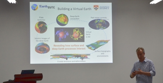 Müller教授首先簡要介紹了悉尼大學(xué)EarthByte課題組基本情況,以及利用EarthByte課題組開發(fā)的GPlates軟件構(gòu)建虛擬地球的方法,展示了其相關(guān)的研究成果。隨后,他詳細(xì)講解了威爾遜旋回中的洋中脊長度、海底擴張速度、俯沖洋殼年齡等參數(shù),影響海水中鈣與鎂的比重、洋底熱流分布的機制。