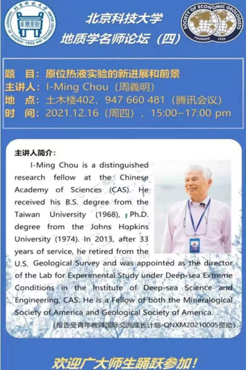 2021年12月16日,中科院深海所深海極端環境模擬研究實驗室主任周義明研究員應北京科技大學鐘日晨副教授及國際經濟地質學家學會北京科技大學學生分會邀請,在線做客“北京科技大學地質學名師論壇”并作題為“原位熱液實驗的新進展和前景”專題講座。