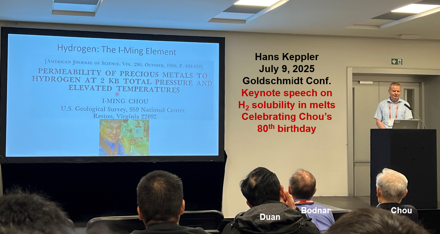 本屆大會參會人數規模達到4400人,還特別設立了專題分會(Session 02n)。該專題分會由六位國內外學者共同發起,共收到50余份摘要,旨在致敬我所周義明研究員在實驗地球化學領域做出的卓越貢獻。德國拜伊羅特大學高壓實驗中心(Bayerisches Geoinstitut)原所長Hans Keppler教授在主旨報告中將氫稱之為“I-Ming Element”,高度評價了周義明研究員在高溫高壓實驗中氧逸度控制與測量技術上的引領貢獻。特邀報告人包括美國國家科學院院士、弗吉尼亞理工大學Robert Bodnar教授,德國地球科學研究中心(GFZ)Christian Schmidt教授,以及巴黎地球物理研究所(IPGP)Razvan Caracas研究員。這一專題不僅彰顯了周義明研究員在國際地球科學界的學術影響力,也為與會者提供了一個深入探討礦物學、礦床學、巖石學以及深??茖W等領域最新進展與未來方向的重要平臺,進一步促進跨學科的合作與交流。
