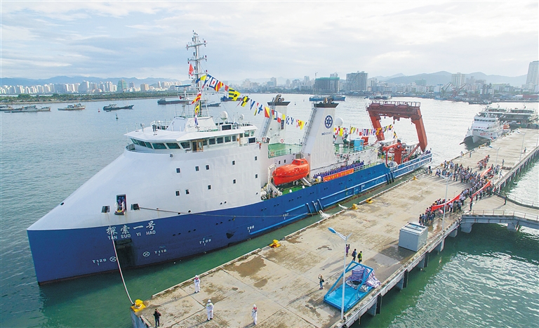 2016年8月12日,“探索一號(hào)”科考船首航太平洋馬里亞納海溝順利歸來,停靠三亞碼頭。