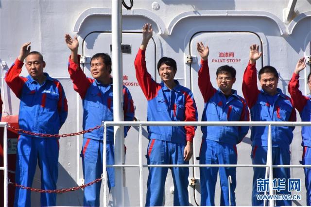 10月16日,參加第三次萬米深淵綜合科考任務的隊員向歡迎人群揮手致意
