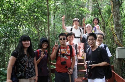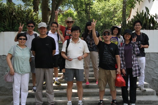 5月11日上午8時許出發(fā),經過兩小時二十分的車程,登山隊伍順利抵達了五指山下。在真正看到素有海南島象征的五指山后,大家都被眼前的美景所陶醉,放眼望去,群山環(huán)繞,云海茫茫。在觀山臺正面眺望五指山,五峰并列如擎天五指,在云海中時隱時現,盡收眼底。隨著一聲令下,大家迅速收拾起陶醉的心情,開始向頂峰攀登。景區(qū)內古樹參天,巨石嵯峨,藤蘿密布,奇花異草隨處可見,大家一邊登山,一邊欣賞著美景,心情格外的舒暢歡愉。途中歡聲笑語不時響起,團隊氣氛輕松融洽,在一些陡峭難行的路段,大家相互幫助,你托我扶,處處體現著同事間的關愛和團隊協(xié)作精神。隨著時間的推移,腳力好的隊員沖鋒在前,已尋不到蹤影。午后一點,天空逐漸陰了下來,不時有點點雨星落下,看著遠遠的山峰,腳下盤根錯節(jié),蜿蜒陡峭的山路,為了安全起見,大家決定簡單休整后下山。當聚在半山腰,圍坐在一起,盡情領略著熱帶原始森林的秀美,享受著精美的午餐時,大家忘卻了登山的勞頓,說說笑笑,儼然成了這美景中的一部分。沖在前面的兩名隊員遲遲未能回歸,經過一番聯(lián)系,電話那頭傳來興奮、驚喜地聲音,原來他們已經登上了最高峰……下午四時許,12名隊員在回程的路上熱鬧的交流著登山的感受,兩名登到頂峰的隊員,更是激動興奮地給大家講頂峰奇特瑰麗的風景,聽得大家仿佛置身其中一斑。