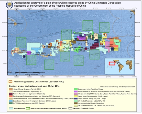 國際海底管理局理事會于牙買加當?shù)貢r間2015年7月20日通過了中國五礦集團公司(簡稱:中國五礦)提出的太平洋多金屬結(jié)核礦區(qū)(申請區(qū)域位于東太平洋克拉里昂-克利珀頓斷裂區(qū),表面積為72740平方公里)勘探申請。至此,中國五礦成為我國首個擁有國際海底礦產(chǎn)資源勘探權(quán)的企業(yè),也讓我國獲得了第四塊國際海底專屬勘探礦區(qū)。