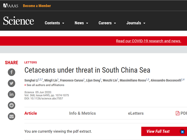 Songhai Li*, Mingli Lin , Francesco Caruso , Lijun Dong, Wenzhi Lin, Massimiliano Rosso, Alessandro Bocconcelli. Cetaceans under threat in South China Sea. 2020, Science 368 (6495), 1074-1075. DOI: 10.1126/science.abc7557