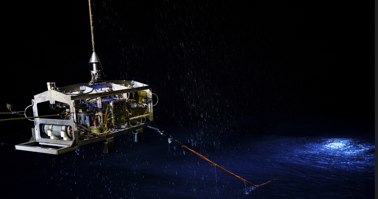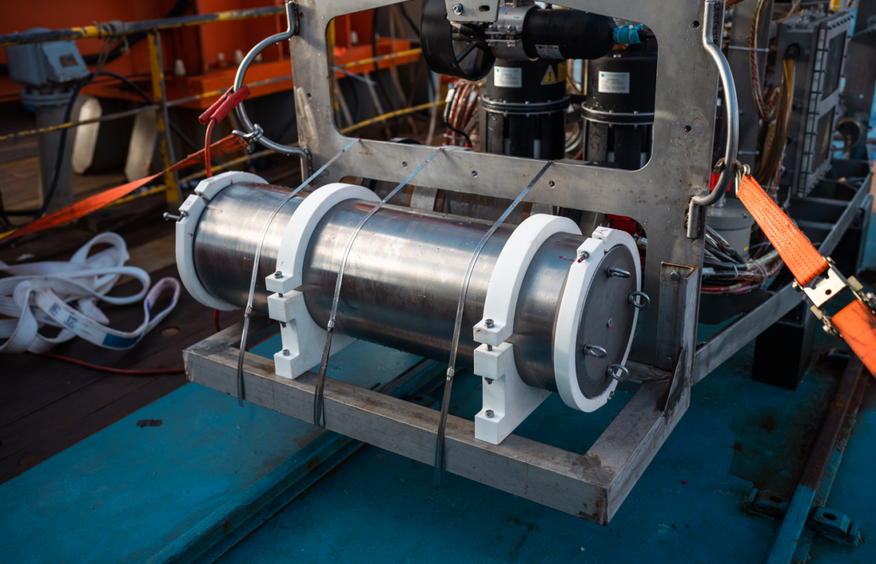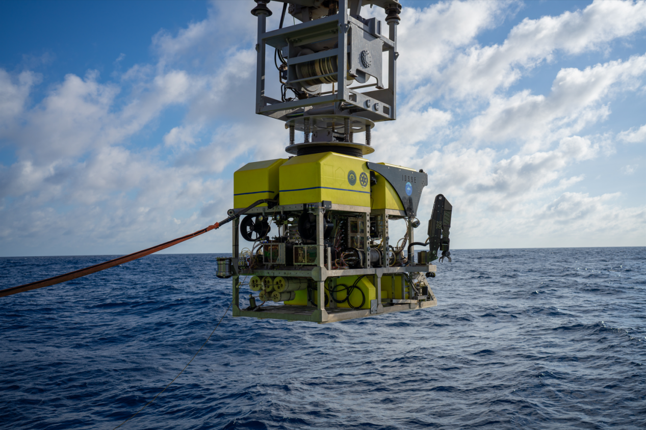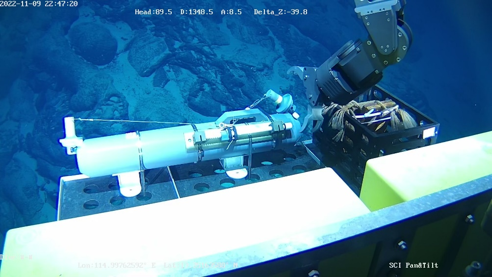 在本航次中,“探索二號”船通過光電復(fù)合鎧裝纜連接至中繼器,再通過非金屬輕質(zhì)光電復(fù)合臍帶纜連接至ROV。中繼器與ROV組成柔性連接的分體式系統(tǒng),該系統(tǒng)進(jìn)行了4500米級海上試驗應(yīng)用,有效驗證了“中繼器-ROV”的分體式布放-回收方案及測試流程,以及ROV各分系統(tǒng)及模塊的設(shè)計性能指標(biāo),并充分測試了ROV在4500m級大工作深度下的綜合作業(yè)能力,如定高、定深、定向、定速、樣品抓取收集等。
