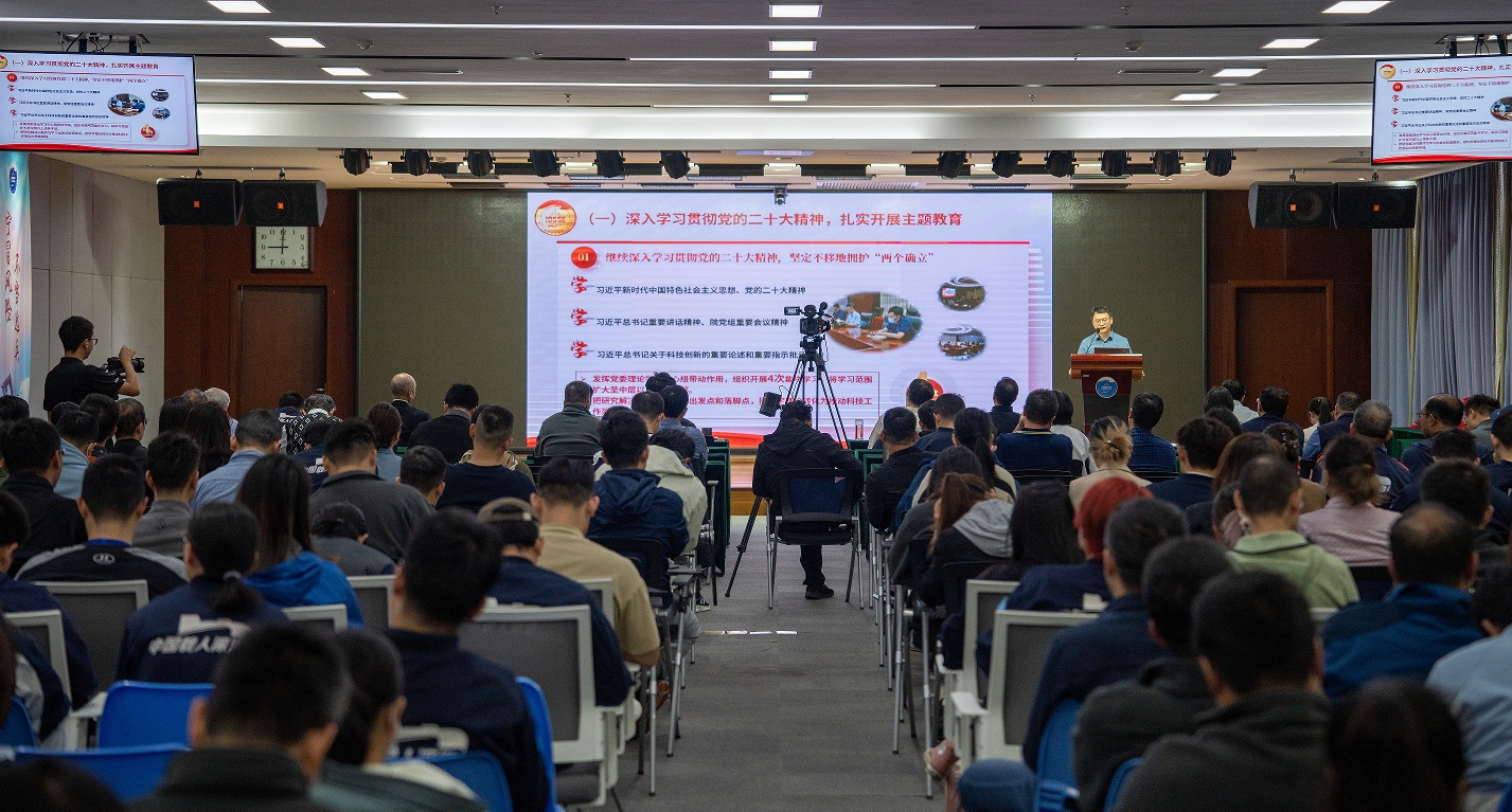 會議分工作總結與表彰兩個環節。總結環節由副所長蔣磊主持。資產財務處處長汪瀚濤作2023年度財務報告,黨委書記彭曉彤代表所黨委作2023年度黨建工作報告,所長丁抗代表所領導班子作2023年度工作總結報告。