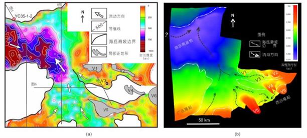 a)海底滑坡沉積厚度圖 V1, V2等代表局部的隆起)(b)海底滑坡底界面的古地貌分析及流動方向重建