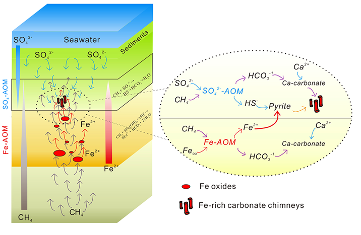 甲烷厭氧氧化作用(AOM)是海洋中的一個重要的生物地球化學(xué)過程,消耗了海洋沉積物中絕大多數(shù)的甲烷,并影響著海底碳酸鹽沉積體的形成。除了硫酸根和硝酸根等能作為電子受體以外,三價鐵(Fe3+)也可以作為潛在的電子受體,驅(qū)動與鐵還原耦合的甲烷厭氧氧化作用(Fe-driven AOM)。盡管已有少量實驗室培養(yǎng)證據(jù)顯示,Fe-driven AOM可能發(fā)生于自然界高甲烷沉積環(huán)境之中,但Fe-driven AOM 發(fā)生的地質(zhì)化石記錄從未被報道過。因而,學(xué)術(shù)界并不清楚這一過程對海洋沉積物中實際甲烷消耗(氧化)的重要程度。