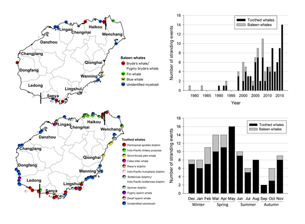 我國南海生物多樣性水平高,海洋哺乳動物資源豐富。通過記錄和分析擱淺事件,可為海洋哺乳動物研究和保護(hù)提供重要的基線信息。深海所海洋哺乳動物研究團(tuán)隊收集了近三十余年海南島沿岸鯨豚擱淺事件,記錄到4種須鯨的7次擱淺事件,10種齒鯨的105次擱淺事件。四種須鯨分別為布氏鯨、鳀鯨、鰛鯨和大翅鯨,須鯨擱淺記錄優(yōu)勢種為布氏鯨;齒鯨擱淺記錄的優(yōu)勢種為熱帶斑海豚、印太江豚和短肢領(lǐng)航鯨。時空分析結(jié)果表明:海南東海岸比西海岸鯨類擱淺記錄多;擱淺記錄在年際上呈現(xiàn)增長趨勢,在季節(jié)上呈現(xiàn)出春季(3?5月)高發(fā)的趨勢?;谝陨辖Y(jié)果,本研究討論了海南島鯨類擱淺歷史,并進(jìn)一步提出了研究、保護(hù)和管理方面的相關(guān)建議。