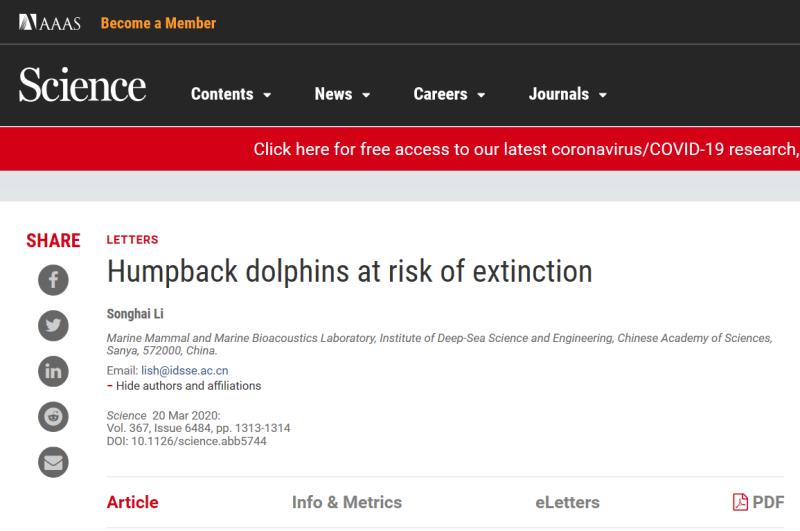 近期,深海所李松海研究員在《Science》期刊上發表題為“Humpback dolphins at risk of extinctionLetter文章。文章結合其研究團隊的相關科研成果和認識,提出中華白海豚等駝海豚屬動物正面臨滅絕的風險,呼吁關注這些動物所面臨的生存威脅,并提出了相關的保護建議以阻止該類珍稀動物的滅絕。