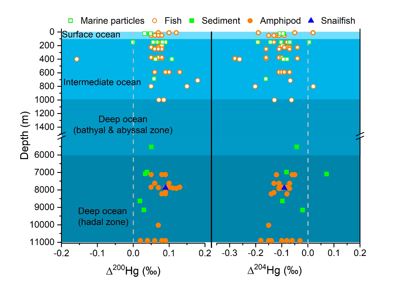 圖1 北太平洋區域樣品中偶數汞同位素非質量分餾值隨水深的變化。
