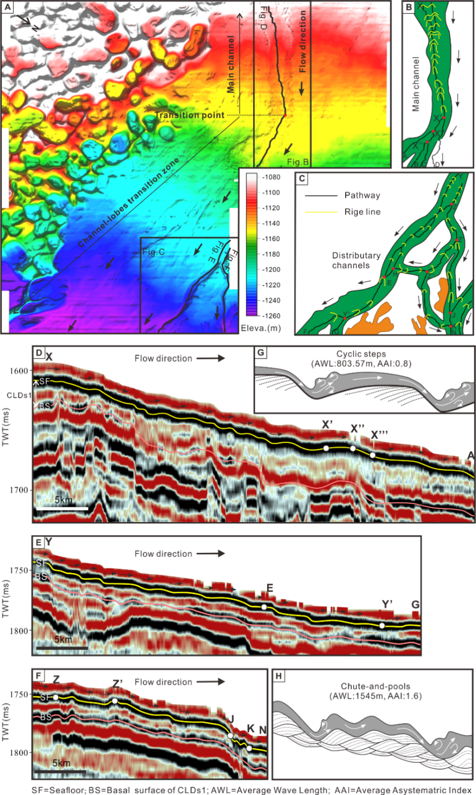 () 盡管前人通過水槽實驗和露頭測量已經建立了濁流底形的理論演化模型,但是,水道-朵葉體轉換帶(the channel–lobe transition zones,簡稱CLTZ)內的濁流底形演化很少有文獻記載,對其了解也非常少。以南海瓊東南盆地高分辨率三維人工地震資料為基礎,采用地震沉積學與海底地貌學結合的分析方法,刻畫了水深1080-1260米、40公里長的現代海底濁流水系;推進了微地貌尺度的深水濁流底形觀測;在CLTZs內,更新了弗洛德數(Fr)整體下降趨勢下,局部超臨界流動和水力躍變的演化模型。
