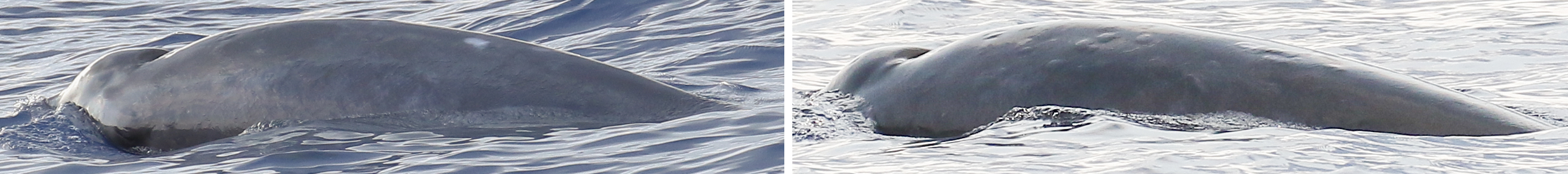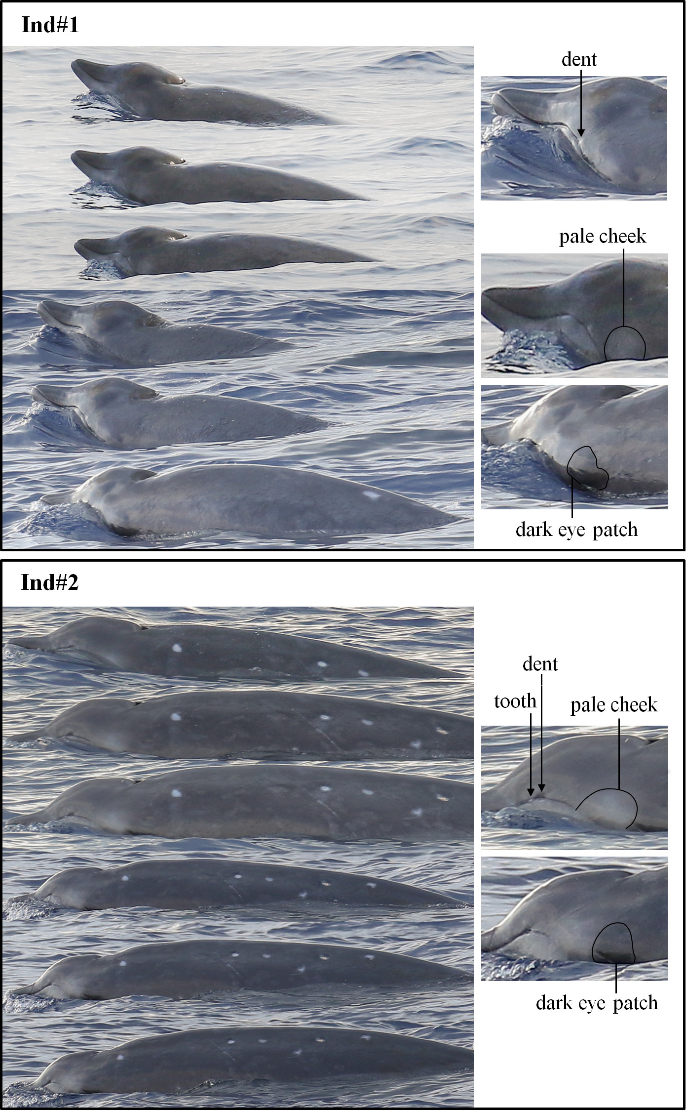 中科院深海所研究團隊在南海目擊到的三頭喙鯨體型相似,視覺上估計體長有4.55米。其中兩頭被拍攝到高清質(zhì)量照片,分別記為ind#1ind#2。中等大小的鐮狀背鰭位于體長約三分之二處(見圖1);體表背部呈灰褐色;上顎呈褐色沒有白邊;下顎和臉頰呈蒼白色;有輕微的黑眼斑;上嘴唇拱形張口后有小凹痕;ind#2有突出的牙齒(見圖2)。兩頭動物體表都有達摩鯊咬痕,愈合的達摩鯊咬痕很少有白色愈合疤痕,大多數(shù)愈合疤痕與周圍皮膚的顏色相同(見圖3)。三頭喙鯨同步進行了三次連續(xù)潛水(淺潛),第四次為深潛,然后消失。呼吸頻率約為每分鐘10次。此外沒有觀察到其它水面行為。