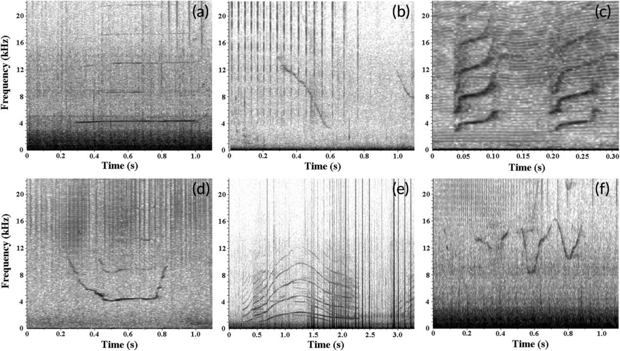 1 本研究記錄到的中華白海豚哨叫聲6種哨叫聲聲譜圖:(a)直線型,(b)下掃型,(c)上掃型,(d)凹型,(e)凸型,(f) 正弦型