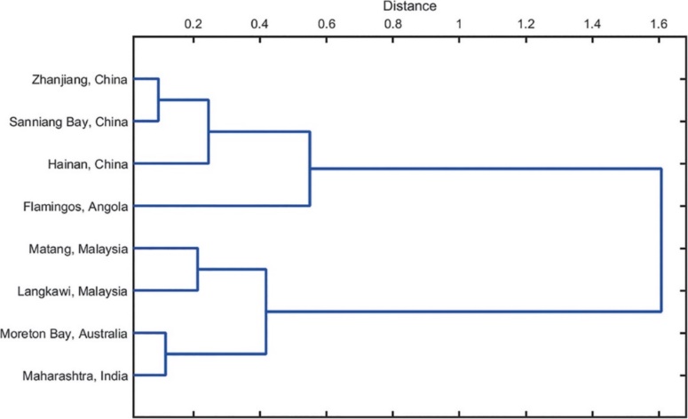 圖2 不同駝海豚地理種群哨叫聲特性相似性的分層聚類結果