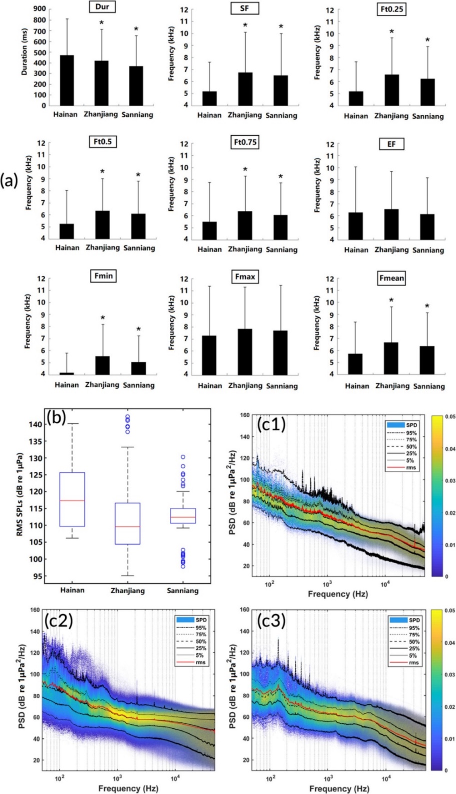 3 海南、湛江和三娘灣中華白海豚地理種群9個哨叫聲參數比較(a),50-48,000 Hz范圍內的寬頻水下噪聲SPLsb),環境噪聲功率譜密度(PSD)和頻譜概率密度(SPD)(c1、c2、c3