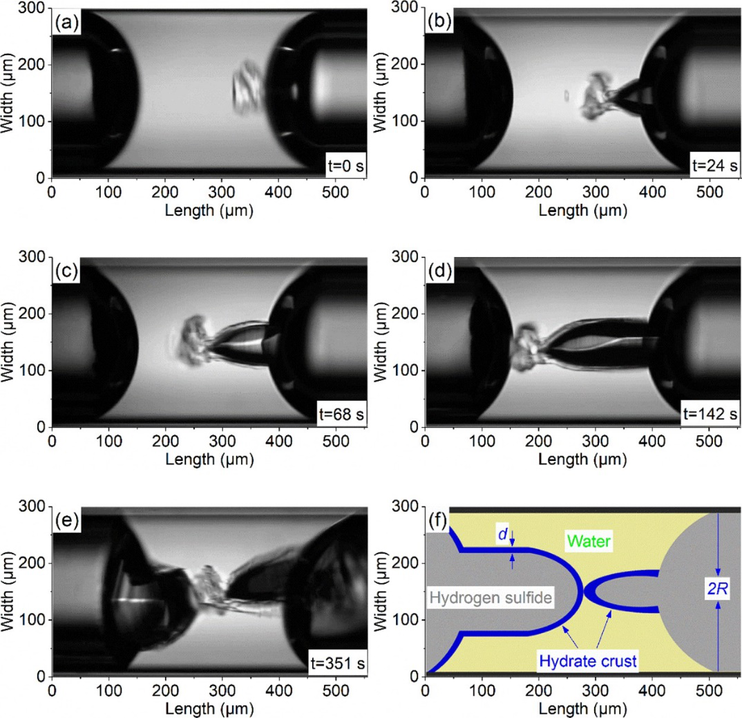 過冷度對微孔隙內水合物的形成特征有較大的影響,高過冷條件下毛細硅管中水-氣彎液面會先形成水合物光環,并向兩側生長,水合物以肉眼不可見的微晶、纖維狀和針狀晶體形態為主;中等過冷條件下水合物晶體以柱狀多面體和骨架晶體為主,水合物的轉化率要低于高過冷條件;低過冷條件下水合物以塊狀多面體形態為主,包括立方體和八面體。同時,該研究首次發現微孔隙內水合物能夠以“橋接”方式連接。相關研究成果發表于《ACS Omega》,“Crystallization Behavior of the Hydrogen Sulfide Hydrate Formed in Microcapillaries”(DOI: 10.1021/acsomega.1c01051)。文章第一作者為深海所博士研究生孫既粵,通訊作者為蔣磊研究員。