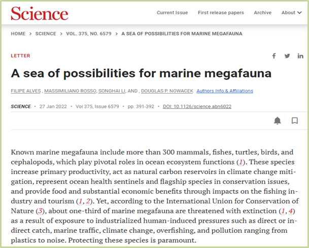 2022年1月27日,來自中國科學院深海科學與工程研究所、美國杜克大學海洋實驗室、葡萄牙海洋與環境科學中心(MARE)以及意大利國際環境監測中心(CIMA)等多家國內外科研機構的科學家,聯名在期刊Science發表了題為“A sea of possibilities for marine megafauna”的Letter文章,旨在共同呼吁加強對海洋大型動物的研究和保護工作。