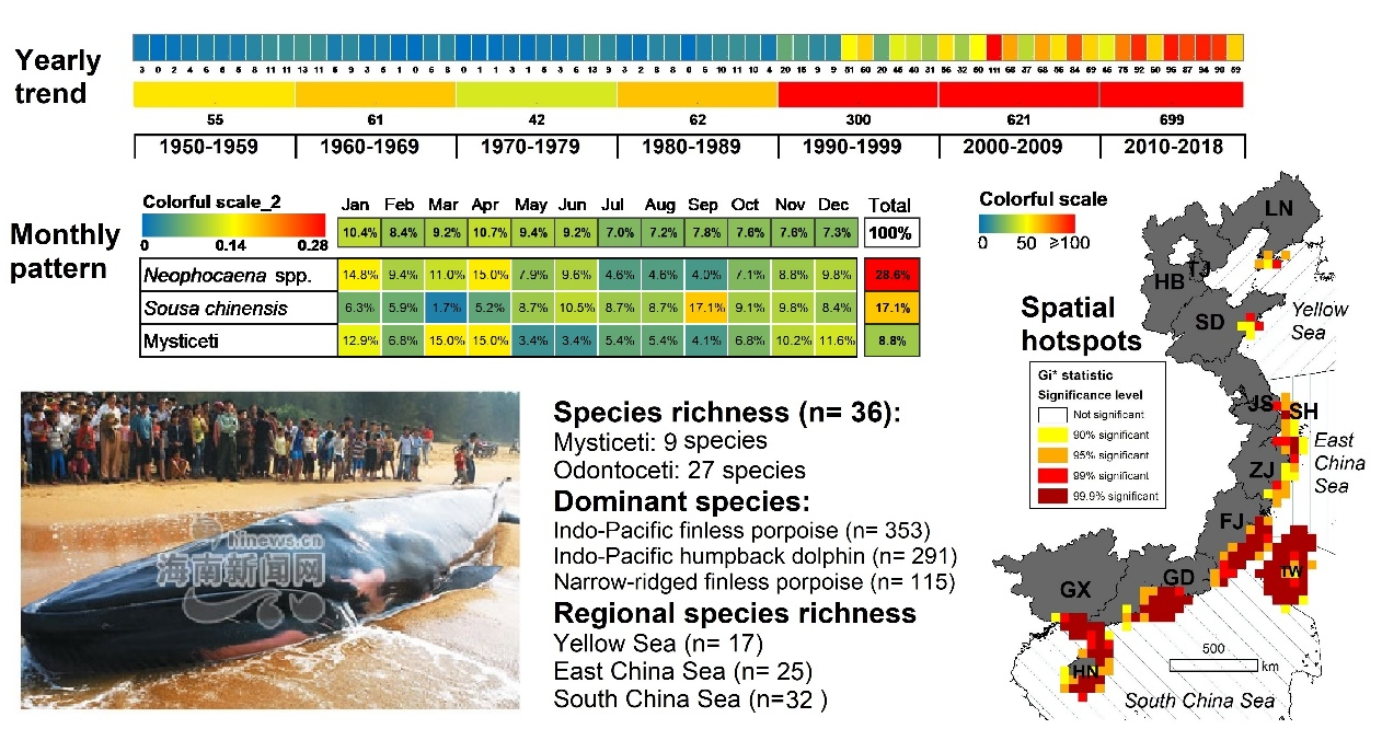 2022年2月4日,中科院深海所海洋哺乳動物研究團隊在國際期刊Science of The Total Environment在線發(fā)表了題為“Species diversity and spatiotemporal patterns based on cetacean stranding records in China, 1950–2018” 的論文。科研人員通過分析我國沿海近70年的鯨類擱淺數(shù)據(jù),較為全面地揭示了我國鯨類的物種多樣性、相對豐度以及時空分布模式等重要信息。