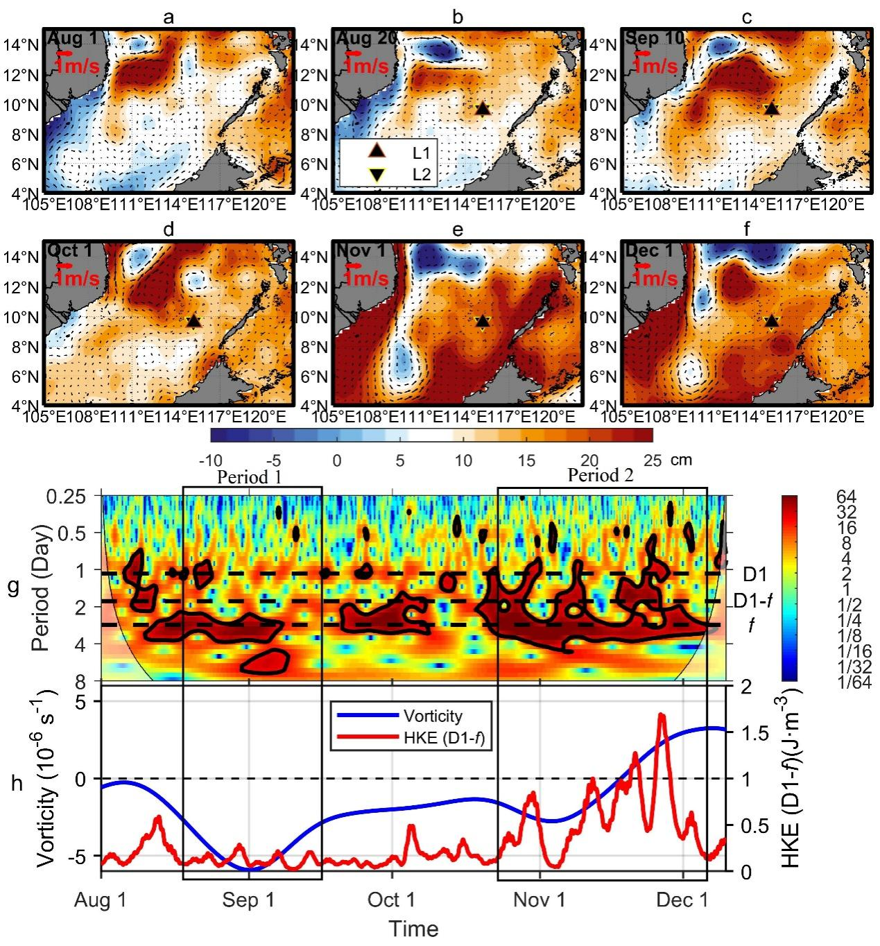 圖1. 觀測(cè)期間南海南部海表高度異常和地轉(zhuǎn)流場(chǎng)分布(a-f),235米深度徑向流速小波能量譜(g),235-350米深度垂向平均渦度(藍(lán)線)和D1-f內(nèi)波HKE(紅線)時(shí)間變化(h)。