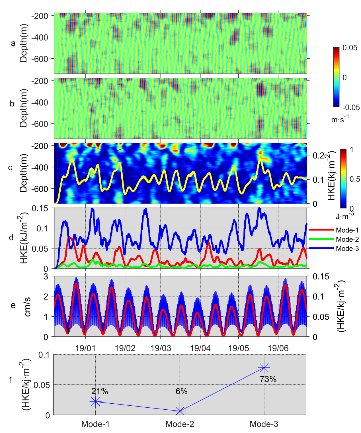 圖2. 觀測(cè)點(diǎn)全日內(nèi)潮速度經(jīng)向分量(a)、緯向分量(b)及全日內(nèi)潮能量(c)。(d)為前三個(gè)垂向模態(tài)能量時(shí)間序列,(e)為TPXO正壓潮能量及其時(shí)間序列。(f)為前三個(gè)垂向模態(tài)能量占比。