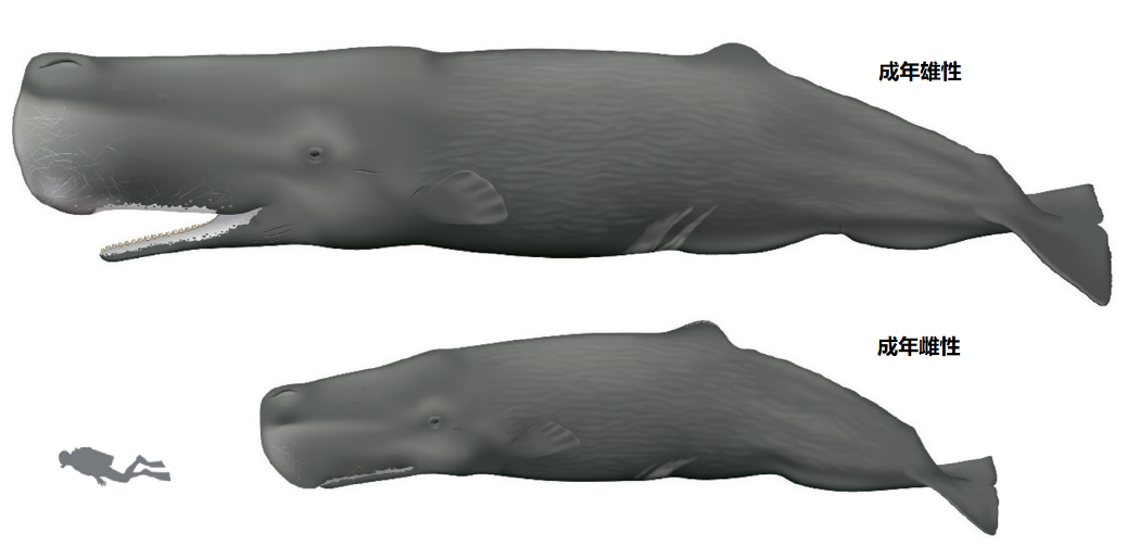 圖2. 抹香鯨雌雄個(gè)體的體型差別(圖片來源于書籍:Marine Mammals of the World)