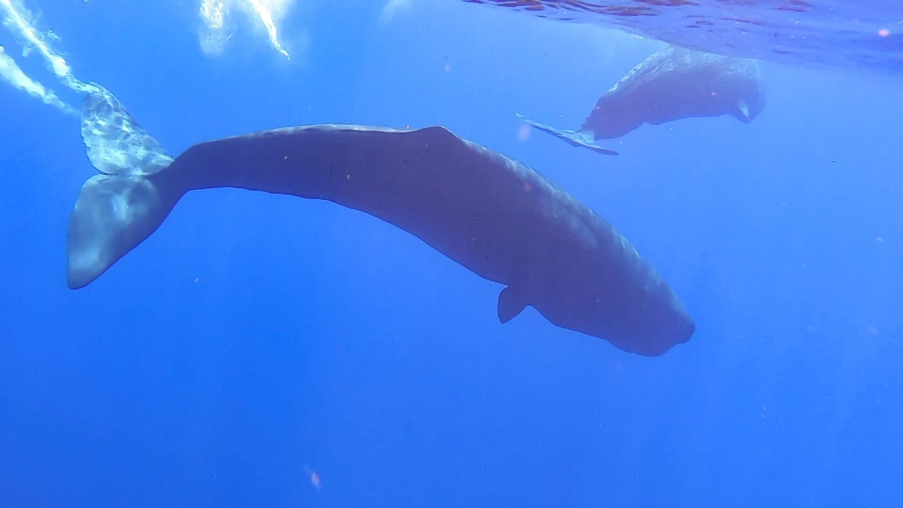 圖7. 南海抹香鯨母子在水下的溫馨畫面(圖片來源:深海所研究團(tuán)隊(duì)和新華社海南分社;拍攝者:林文治/劉明明/張麗蕓)