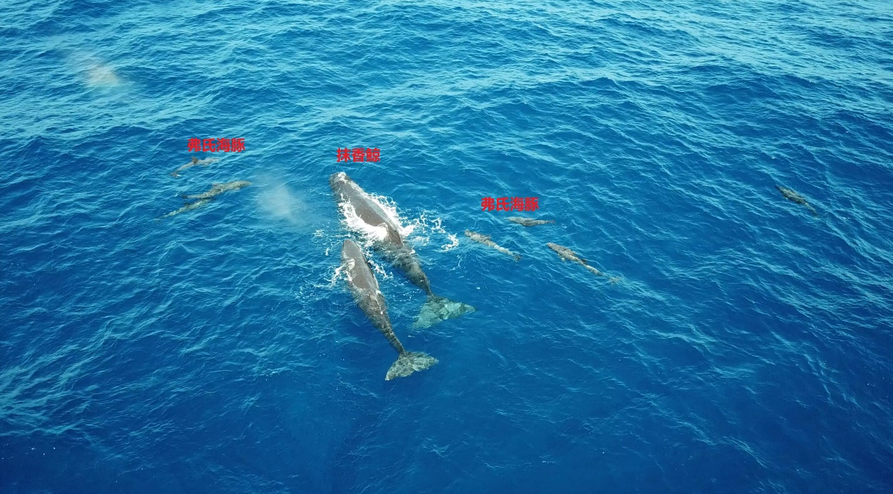 圖9. 南海抹香鯨與弗氏海豚形成的“鯨豚混游”現(xiàn)象(圖片來源:深海所研究團(tuán)隊(duì);拍攝者:劉明明)