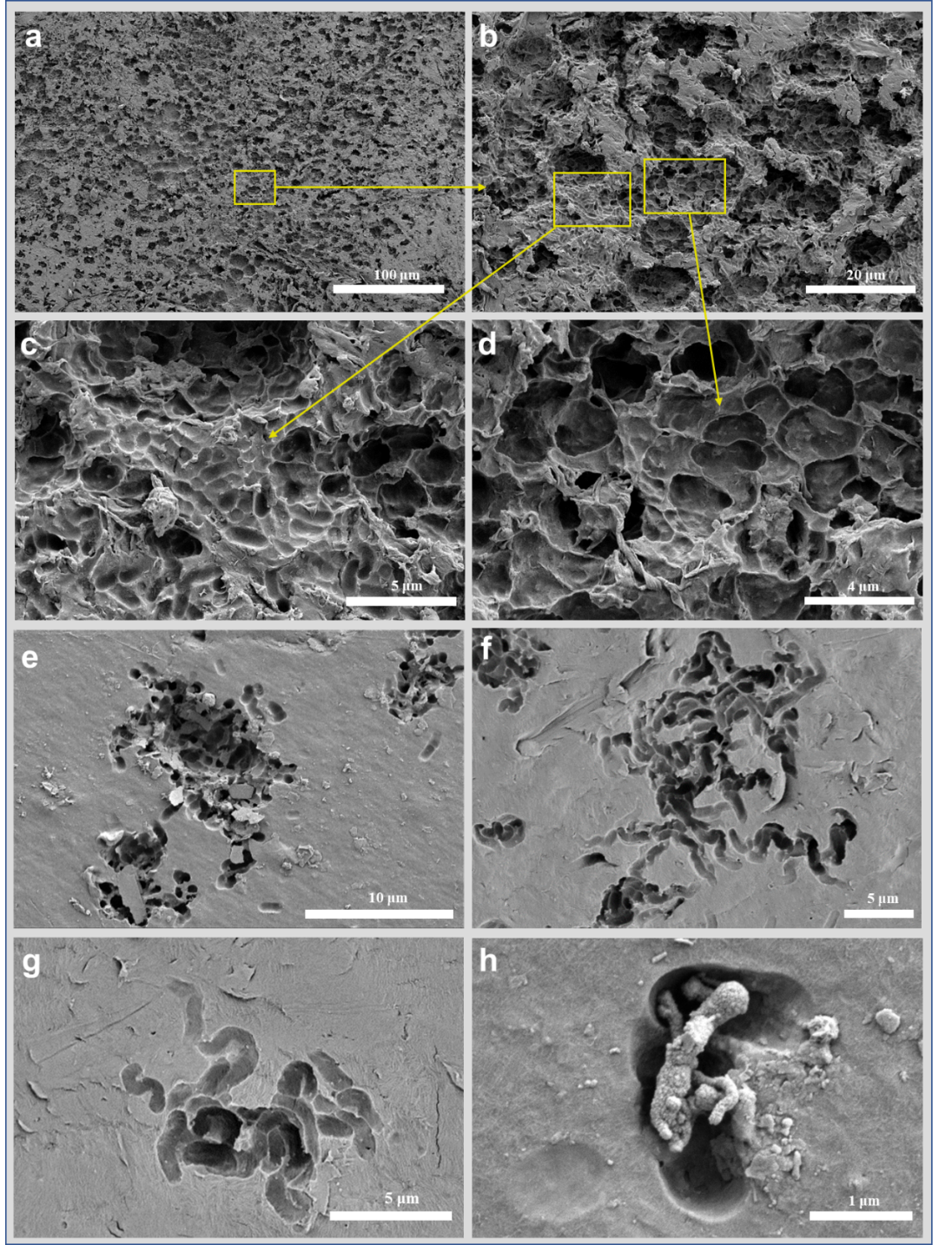 有趣的是,在18片PE表面還發現了大量與桿狀微生物的形態相一致的溶蝕坑結構(圖2),所有凹坑的長度均為1-2μm。如圖2a-d所示,該塑料表面有大片相互連接的蝕坑,主要包括短棒狀和花生狀兩種結構,呈現高度降解。此外,在其他樣品表面還觀察到不同形態的蝕坑,例如蠕蟲狀和絲狀結構(圖2e-g)。