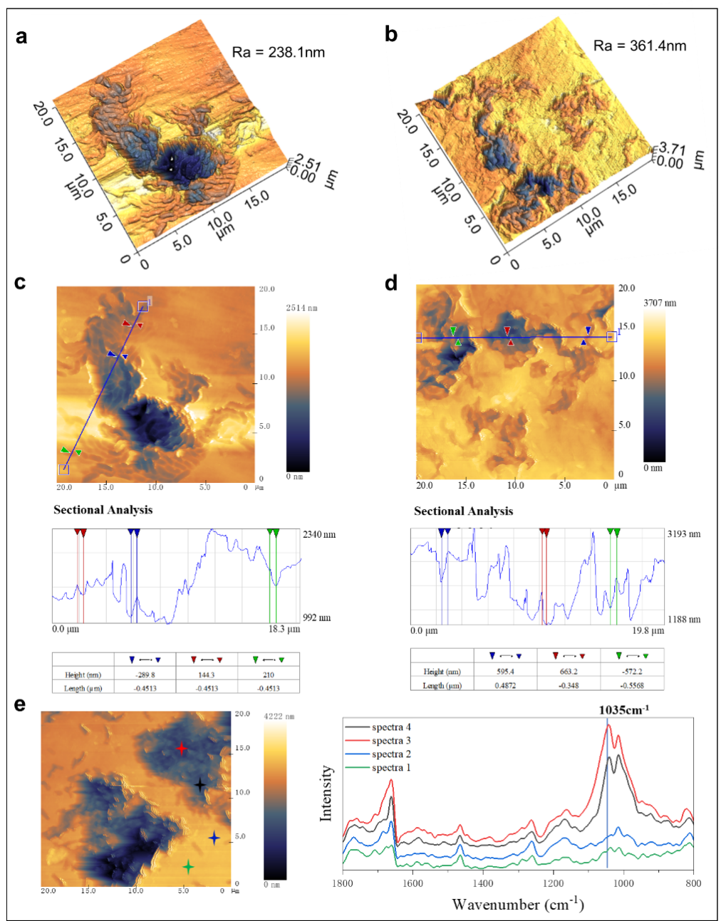 通過光誘導力顯微鏡(PiFM)再現了典型蠕蟲結構的三維形態學(圖3a,b)。Ra(粗糙度平均值)通常用于指示表面粗糙度。很明顯,降解程度越高的塑料表現出較高的粗糙度。與掃描電鏡(SEM)相比, PiFM在垂直方向上具有更高的準確度和精密度,可用于探測凹坑的深度。如圖3所示,在相對早期的降解階段,蠕蟲狀凹坑的寬度約為0.9μm(0.45×2μm),深度約為144.3-289.8nm。隨著降解的發展,坑深度變大,約為572.2-663.2 nm。