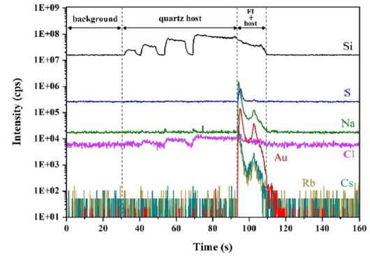 圖2.合成流體包裹體的激光剝蝕等離子體質譜分析信號。以Na、Rb及Cs為內標而測得的最高含金量為3599 ppm, 幾乎是至今所有實驗結果的最高值