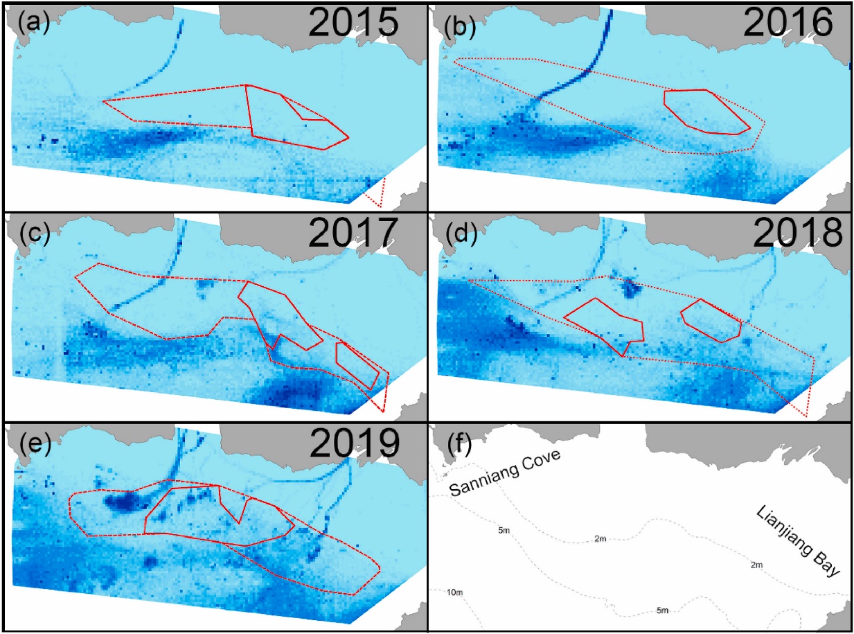 圖1. a-e展示2015-2019年大風(fēng)江口水域船舶活動;f展示三娘灣、廉江灣位置