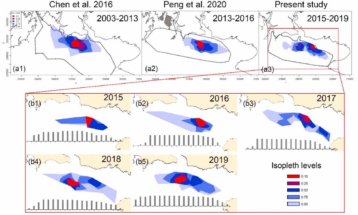2022年12月20日,中科院深海所海洋哺乳動物研究團隊與汕頭大學(xué)研究團隊合作,在國際學(xué)術(shù)期刊Journal of Environmental Management發(fā)表題為《Ranging pattern development of a declining delphinid population: A potential cascade effect of vessel activities》的研究文章。該研究提取了北京大學(xué)、北部灣大學(xué)、廣西省科學(xué)院等團隊在北部灣大風(fēng)江口水域(下稱該水域)的已發(fā)表目擊數(shù)據(jù),并整合了深海所與汕頭大學(xué)2015年至2019年間系統(tǒng)調(diào)查結(jié)果,分析該海域中華白海豚空間分布的長期變化。研究結(jié)果顯示,該水域中華白海豚的活動范圍在本世紀初顯著減少。盡管海豚的整體活動范圍在近十年內(nèi)較為穩(wěn)定地集中在三娘灣至廉江灣一帶海域,但海豚的核心棲息地存在明顯的偏移。與早期空間分布模式相比,該海域的海豚核心棲息地在2015-2017年間從三娘灣沿岸東移至廉江灣外圍海域,而又在2018-2019年稍回落至三娘灣一側(cè)。