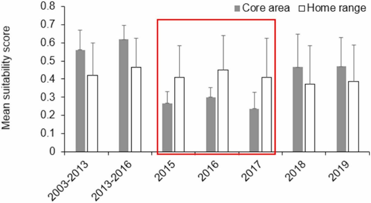 該研究進一步建立了該水域中華白海豚環(huán)境適合度模型,發(fā)現(xiàn)該種群在2015-2017年的核心活動范圍并非白海豚的最適宜棲息地。此期間海豚核心活動范圍的棲息地平均適合度甚至要低于整體家域的平均適合度。與之對應(yīng)的是,研究團隊不久前發(fā)現(xiàn)該水域中華白海豚的存活率在棲息地東移期間處于極低水平。基于這些發(fā)現(xiàn),研究人員提出該水域中華白海豚種群波動的新假說:船舶活動的快速增長改變了中華白海豚的空間利用策略,進入船舶活動強度低但適合度較低的水域活動;而在低適合度的環(huán)境生活的風(fēng)險造成適應(yīng)度大幅降低,并經(jīng)歷了快速的種群衰退。最終海豚權(quán)衡船舶和棲息地適合度的影響,重新調(diào)整空間使用策略而回到船舶活動強度高但適合度更高的水域生活。